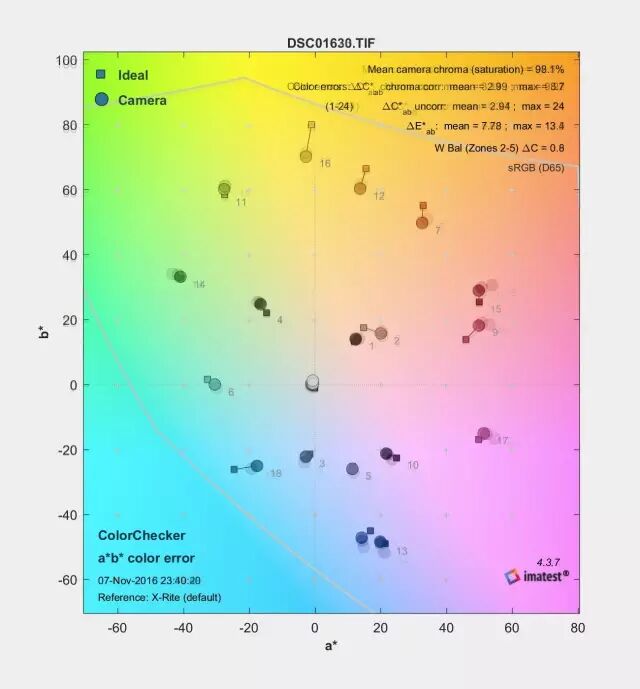 三张叠加之后可以看到除了9、15、17(红色/粉色)色块之外其他色彩还原都几乎一致(沿着边缘和中心连线的区别只是明度差异不是显性特征)9、15、17三个色块偏差最大(最靠外)的三个圆是尼康70200VR,也就是说在拍摄红色时会更红(粉)一些(说好的尼康黄呢)。佳能和索尼发色倾向基本一致,较为靠近的两个圈圈里,实一点的是索尼70200GM,虚一点的是佳能70200IS,大家可以在上图中自行比对参考。