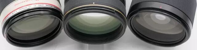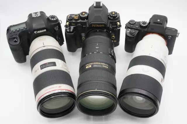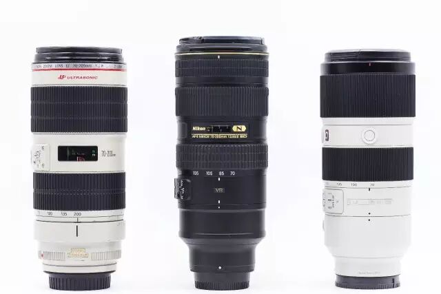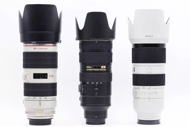 三支镜头从左到右分别是佳能EF 70-200mm f/2.8L IS II USM(以下简称小白兔或者70200IS等),尼康AF-s 70-200mm f/2.8G ED VRII(以下简称70200VR、大竹炮等) ,索尼FE 70-200mm f/2.8 GM OSS(以下简称70200GM等)。三支镜头都采用内对焦内变焦设计,整个使用过程中镜头的长度不会发生任何变化。