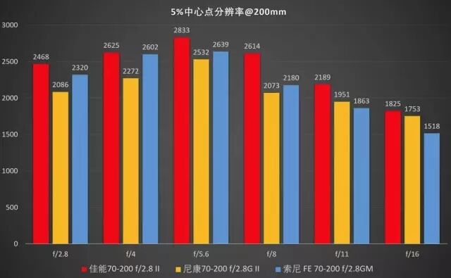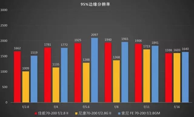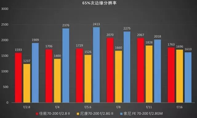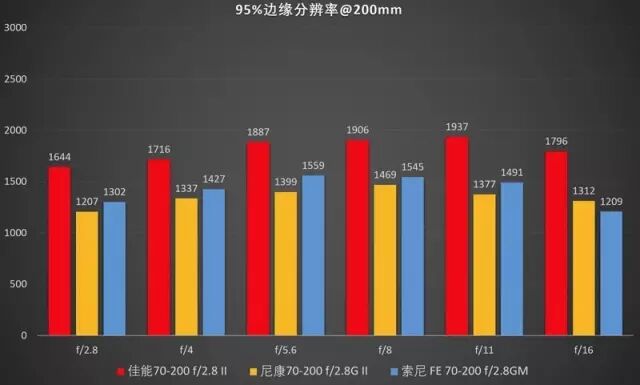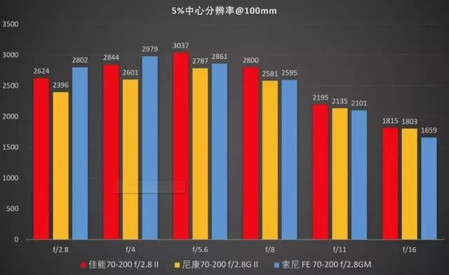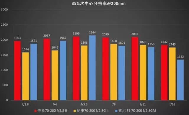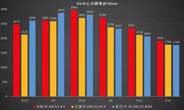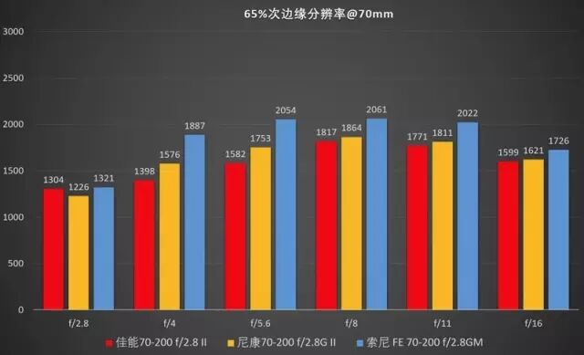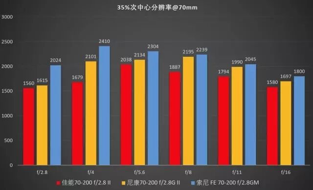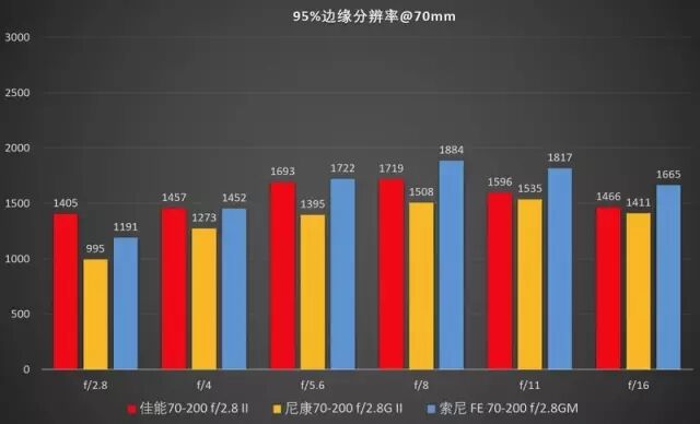 从70mm端的分辨率上来看,佳能70200IS和索尼70200GM各具优势,前者的最佳光圈在f/5.6,全像场的均匀性表现较好。后者的最佳光圈在f/4,突出的优势在于中心画质。从这类镜头日常使用环境来看,70200GM明显在拍人像特写之类的环境下会更具有解析力上的优势。而且稍微收一点点光圈就可以得到最佳画质,实用性上相当好。至于尼康70-200VR,无论是大光圈还是小光圈画质都落后于前两者,希望E版(电磁光圈版)的新品可以带来更好的画质。