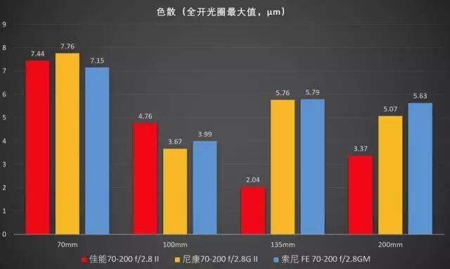 色散方面其实根据焦距的不同变化也比较大,佳能仍然保留了越长越强的特性,而索尼和尼康都是中间焦距最强。不过三支镜头的色散控制都属于良好到优秀的水平,不会对实际使用造成太负面的影响。