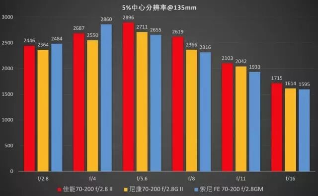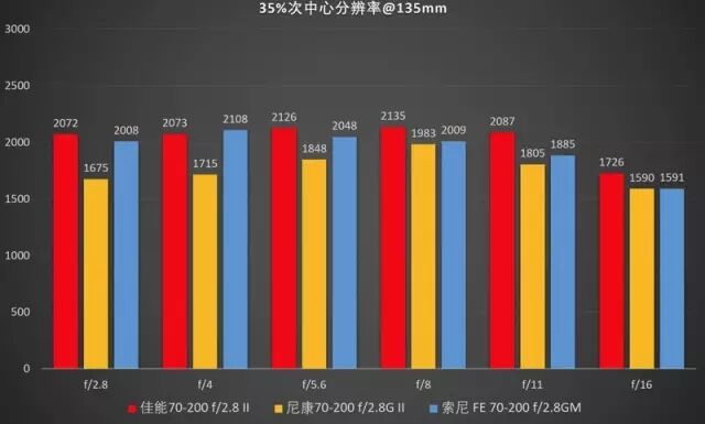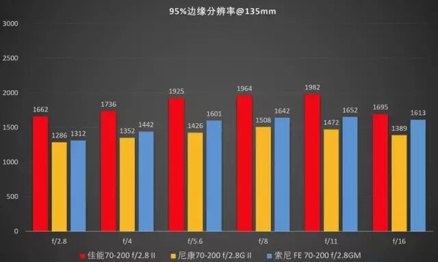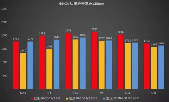 135mm焦距下佳能70200IS再次反超索尼70200GM,而且这次有优势的是边缘画质。最佳光圈方面几只镜头都没有什么变化,尼康的表现依然是有点不尽如人意,但是相对之前的焦段表现已经是好多了。
