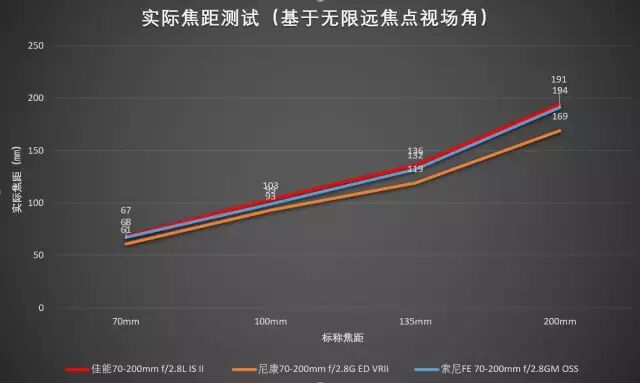 其实在2010年当时尼康和佳能相继更新自己二代70200镜头的时候,坊间就有一种传闻说尼康的焦距其实不足额,实际拍出来200端比佳能要广一些。我们针对这个传言也进行了测试,测试方法很简单,用激光测距仪测量镜头成像的对焦距离和视场对角线距,然后解三角形,计算出实际的成像视场角,并换算成物理焦距值。测试过程中镜头对焦于无限远,光圈收到最小以获取清晰的成像边缘。