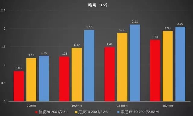 暗角最严重的是索尼70200GM,其次是尼康70200VR,控制得最好的是佳能70200IS。