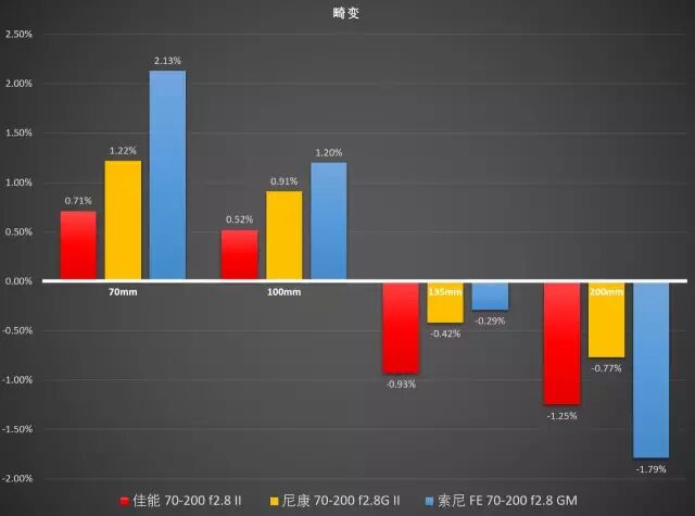 三支镜头都是从广角端的桶形畸变(+)过渡到长焦端的枕形畸变(-)。最严重的是索尼70200GM(只在135焦距段具有最好的表现,应该是变化过程当中过零点的原因)。不过都不算太夸张,校正之后几乎不会有什么额外的影响。