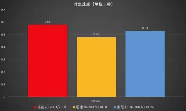 与以往的测试方法相同,佳能70200IS搭配佳能5D4机身,尼康70200VR搭配尼康D810机身,索尼70200GM搭配索尼A7R2机身进行测试,。对焦范围无限远到3米,计量时间3次取平均值,环境照度200lux。
