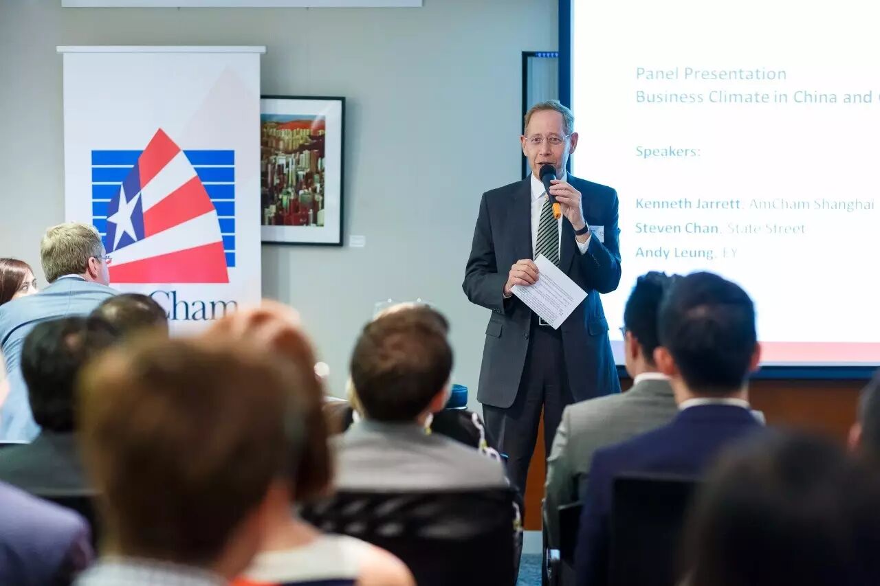 Nearly 80 professionals turned out for a sold out Hong Kong networking event jointly hosted by AmCham Shanghai and AmCham Hong Kong. The program portion of the evening included remarks from Chamber President Kenneth Jarrett, Steven Chan, Managing Director and Regional Head of Regulatory, Industry and Government Affairs at State Street Asia, and Andy Leung, Director of the Indirect Tax Division at Ernst & Young.