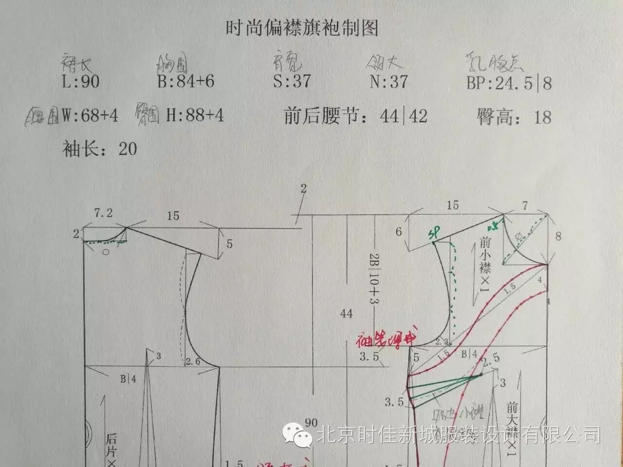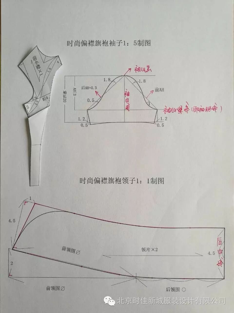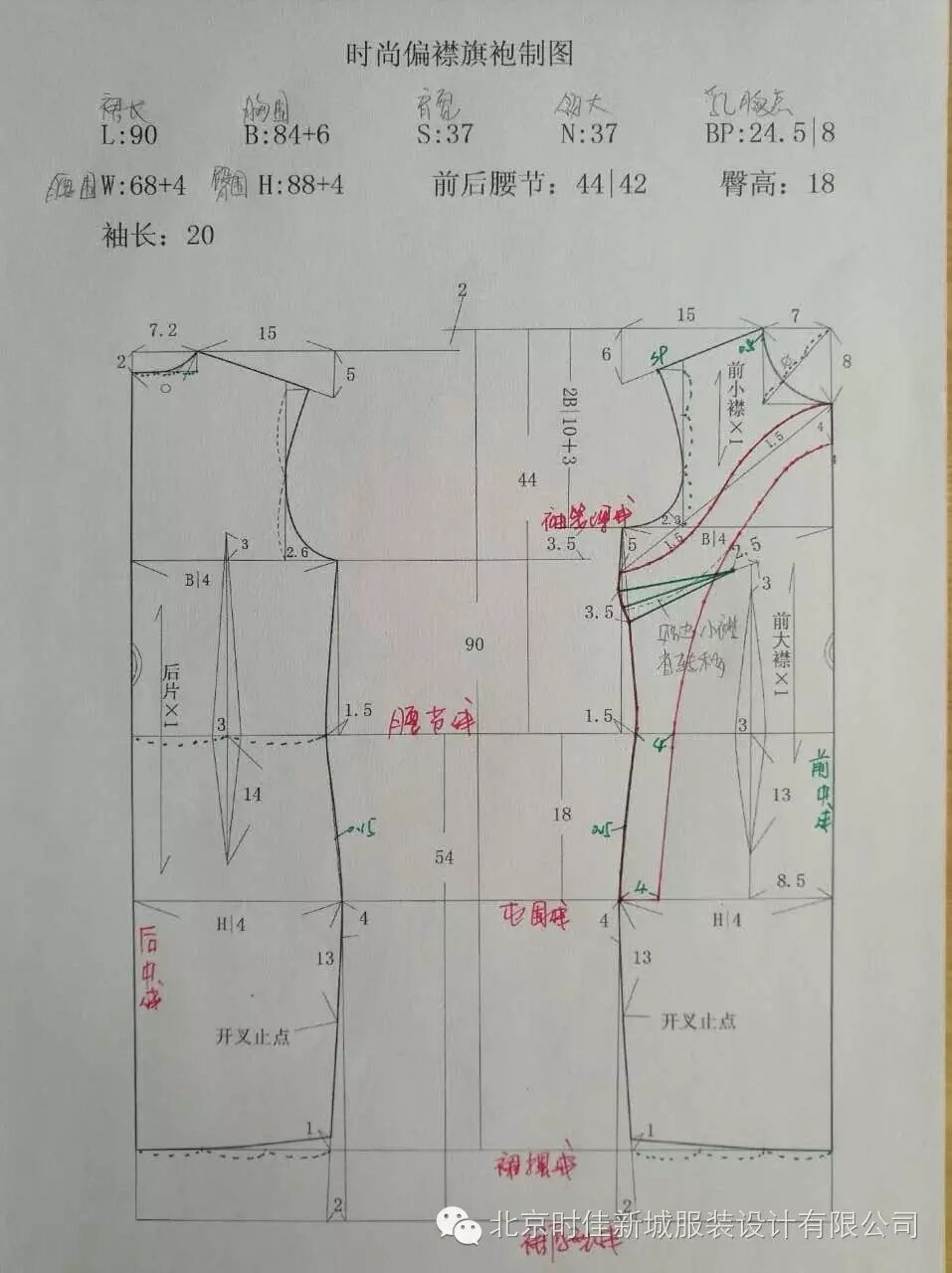 学服装制版的旗袍制图是单层的,整个前片有:前大襟,前小襟,大襟贴边;后片是一整片连裁;领片双层;袖子两片;滚边布料、盘扣布料若干长,宽3.5cm-4cm,45°正斜丝。