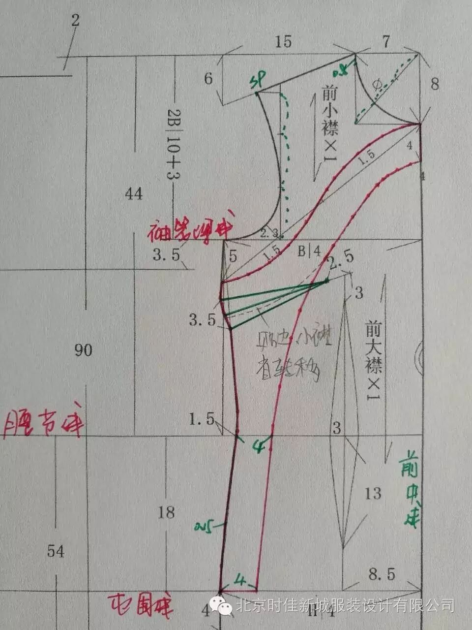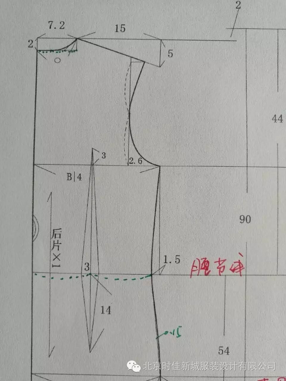 14、腰省:B-W=18cm,侧腰分1.5cm,中腰分3cm。