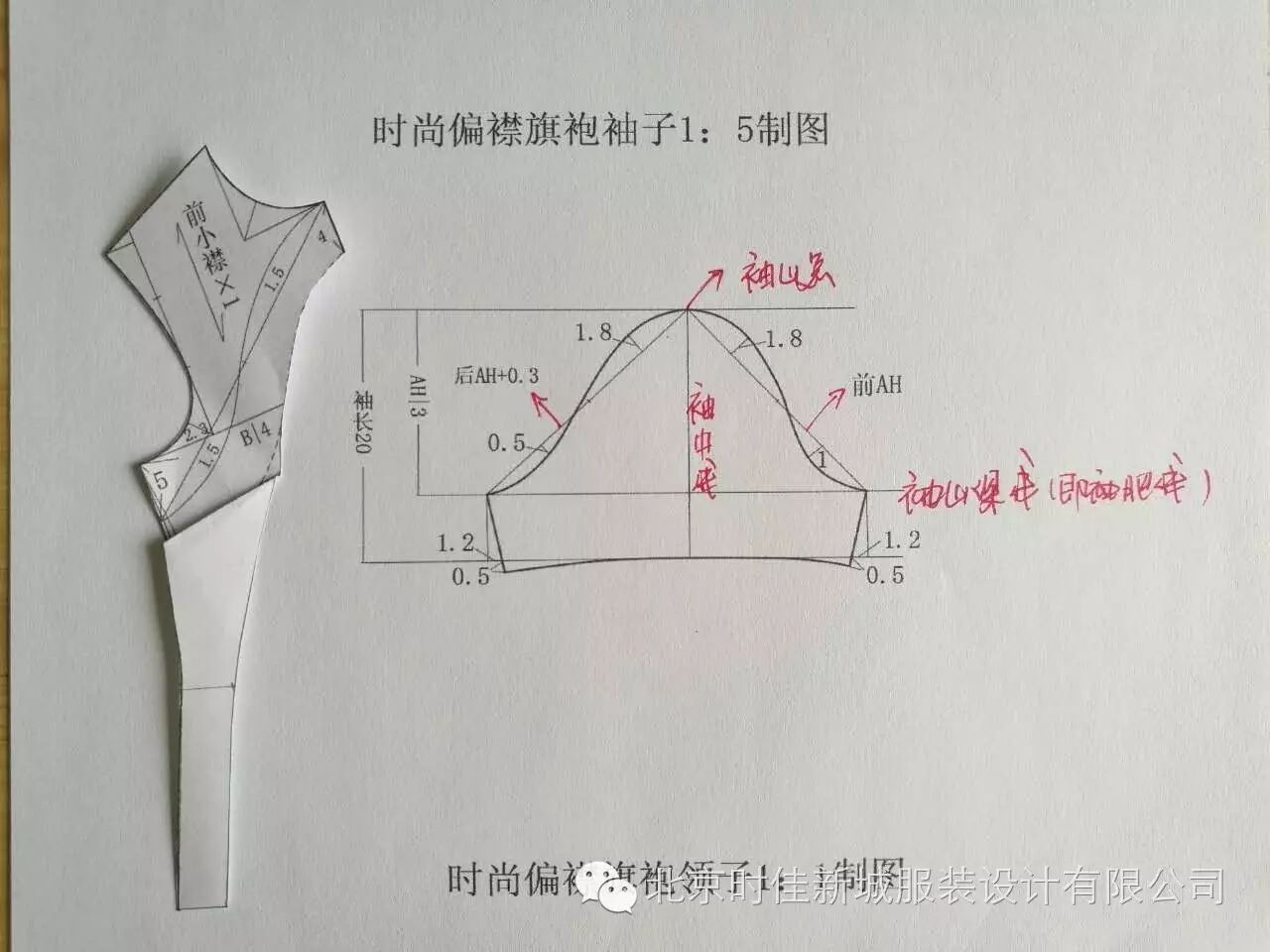 4、袖肥:由袖山点往右在袖山深线量前AH,由袖山点往左在袖山深线量后AH+0.3cm