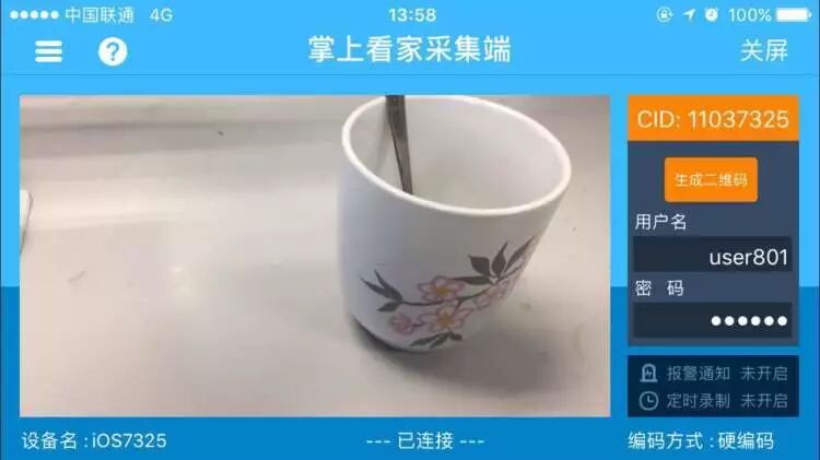 在安装掌上看家采集端app,打开之后会自动获取用户名、密码和相应的二维码,可以直接授权访问相机之后就摄像头就开始工作了。