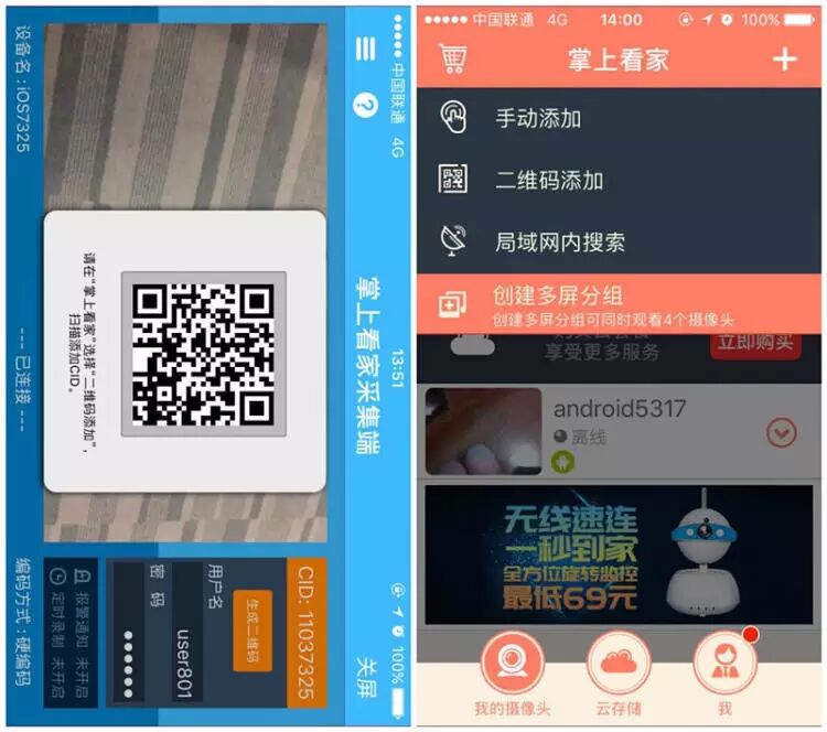 直接扫左边采集端app的二维码就能在右边的掌上看家上看到和采集端一致的画面,在保证网络环境的情况下,两个客户端的画面周到君亲测是同步的,没有迟滞。
