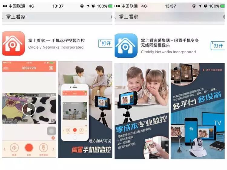 搜索“掌上看家”会出现蓝色和红色两个app,分别是采集端和监控端app,两者差别简单来说,蓝色的app用来把手机变成摄像头,而安装了红色的app才能观看监控录像。