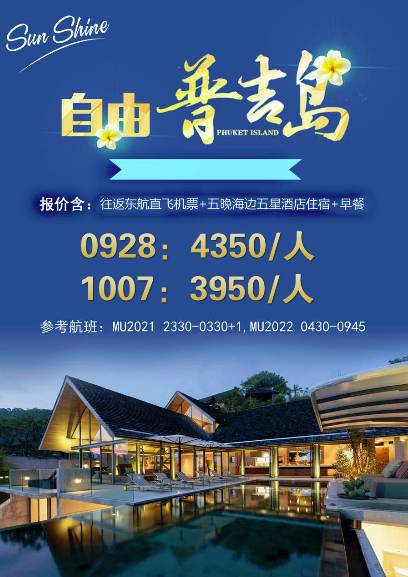 第一天 | 杭州Q普吉,参考航班 MU2021(2330-0330+1)以实际开票为准 于杭州萧山国际机场集合,飞往普吉岛。抵达后入住酒店休息。 |