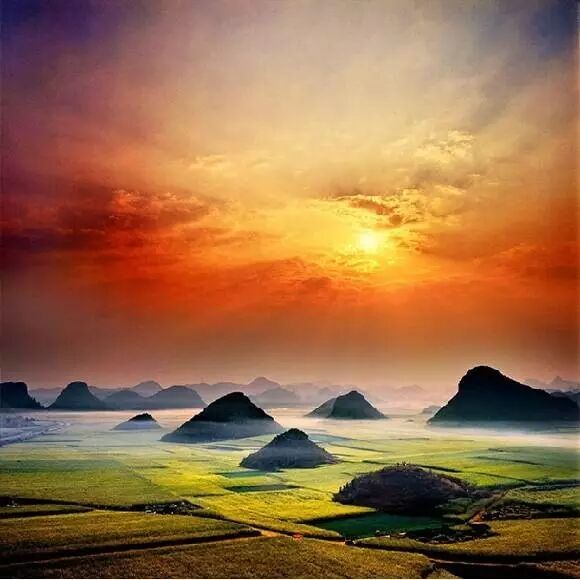 作为菜花节的主会场,金鸡峰丛是罗平最出名的观景点。数不胜数的锥状小山丛错落有致地排列在坝子里,蔚为壮观。金鸡峰丛的晨雾日出非常漂亮,最佳拍摄地可以在324国道左边的大黒山,同时也是观赏金鸡峰丛景区的最佳点,站在山顶放眼望去是一片金色的海洋。