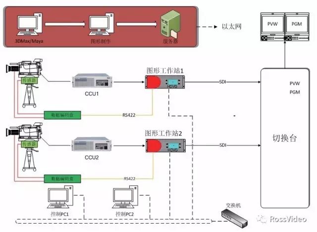 也许你对虚拟植入系统还不太了解,我们在这里先做个简单介绍。虚拟植入系统分两部分,图形处理和摄像机运动跟踪,图形处理部分包括:图形制作设备、图形播控设备、图形工作站,各采用一台计算机完成各自工作;摄像机跟踪部分包括摄像机传感器、跟踪信号处理相关软硬件。虚拟植入系统的工作流程包括虚拟场景制作、镜头校正、标定三维模型的相对空间位置信息,操作播控工作站控制三维场景的播出。