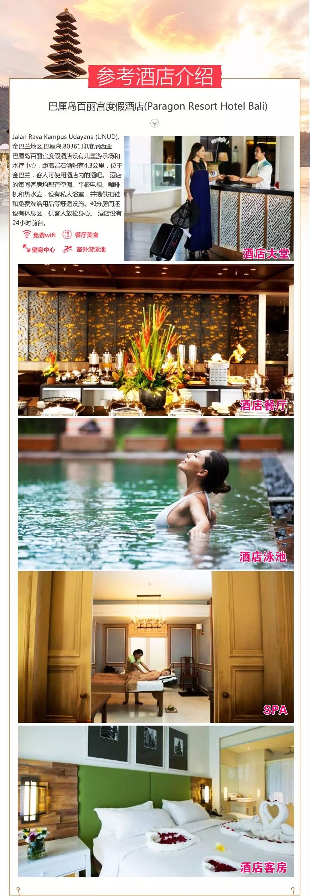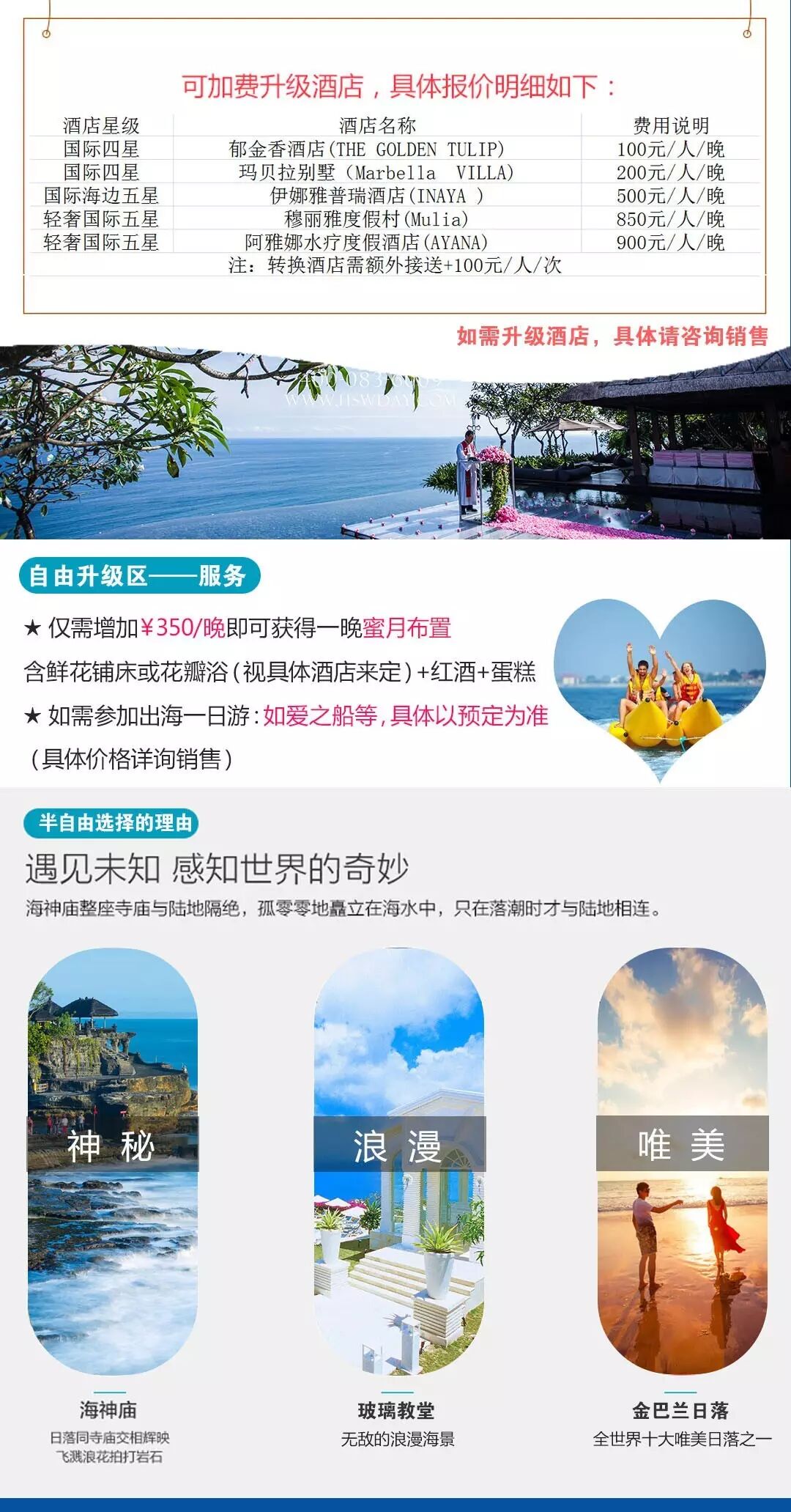 巴厘岛是度假圣地,蜜月天堂,酒店和别墅均以大床房为主,恕不能保证标双或大床,请游客报名前注意。酒店依照该区域地形建造,故此所处位置以及空间大小都有一定差别,团体入住所安排别墅以及巴厘岛酒店房型