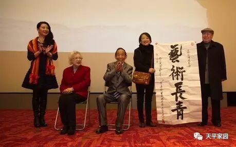 而对于天平街道的人们来说,秦怡老师更是“邻家奶奶”,是天平“名家坊”首批成员!在今天的活动现场,同为“名家坊”成员的尚长荣、陆春龄、孙渝烽、曹燕珍、马晓晖等也前来道贺。陆春龄老师更将亲笔书写的书法作品“艺术长青”赠送给秦怡老师。