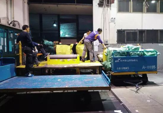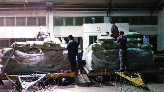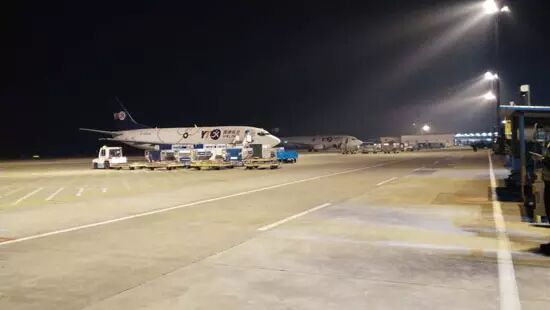 11月12日00:34,发往成都的货物终于到达停机坪,工作人员陆续将散货装机。
