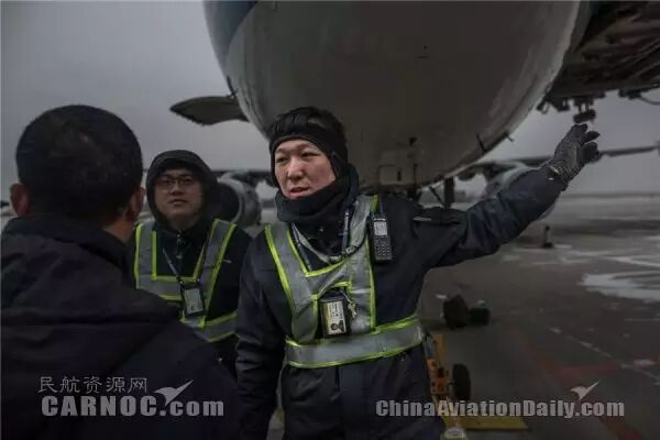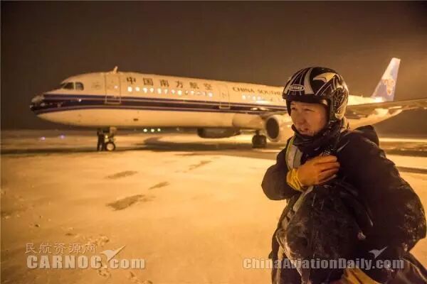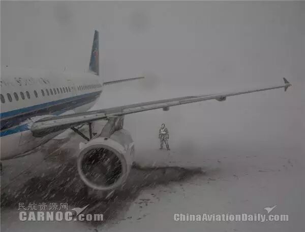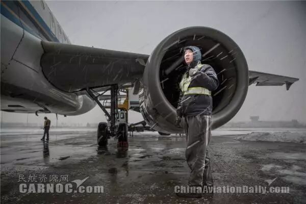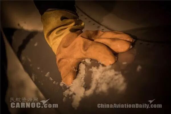 图:王翀用手去清除发动机整流罩上的积雪(文:沈卓/图:陈松)