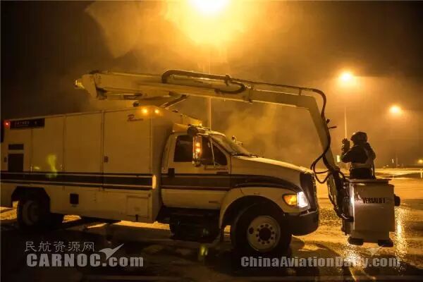图:飞机除冰师要经过特种作业培训,取得上岗资格才能执行此项工作。除冰作业对风向的判断和喷射点、喷量的选择都有专业的要求。飞机上的各种天线是不能喷上除冰液体的。(文:沈卓/图:陈松)