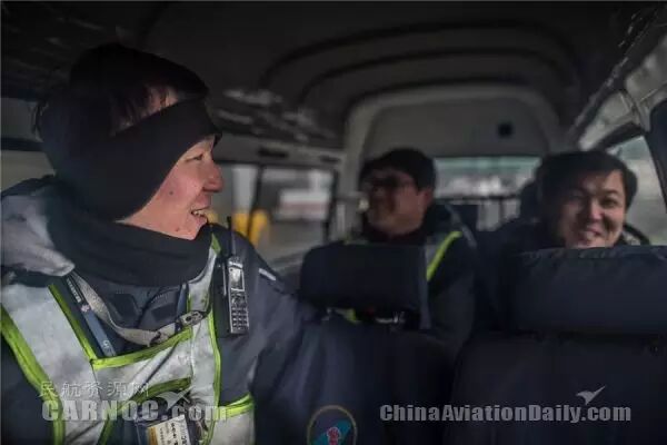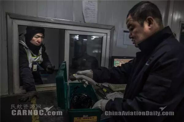 图:对讲机传来声音,通知他前往112号机位,排除发动机滑油系统故障,王翀与其他除冰师交接了工作,前往排故现场。(文:沈卓/图:陈松)