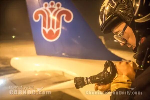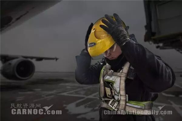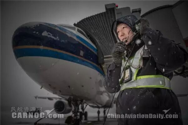 图:王翀是南航沈阳飞机维修基地一名机械师,平时的工作为航班进行航线维护、排除隐患。但遇到冬季大雪天气,王翀马上戴上头盔升到10米高空为飞机除冰雪保障飞机安全运行。(文:沈卓/图:陈松)