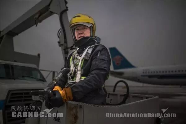图:高空中的风很大比地面还要冷许多,握住除冰喷头的手经常冻得失去知觉。(文:沈卓/图:陈松)