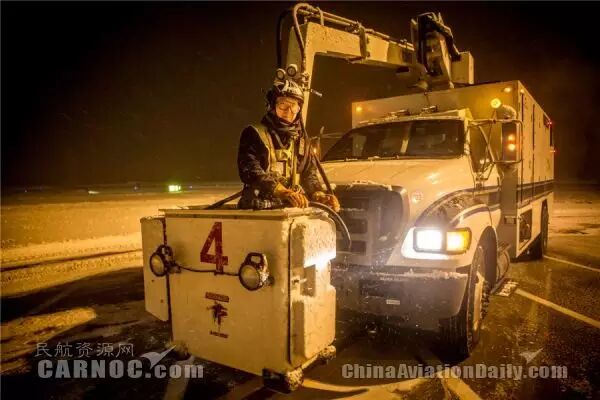 图:接着清除下一架飞机的冰雪。像这样的暴雪天气,他一天需要清除15架飞机的冰雪。(文:沈卓/图:陈松)