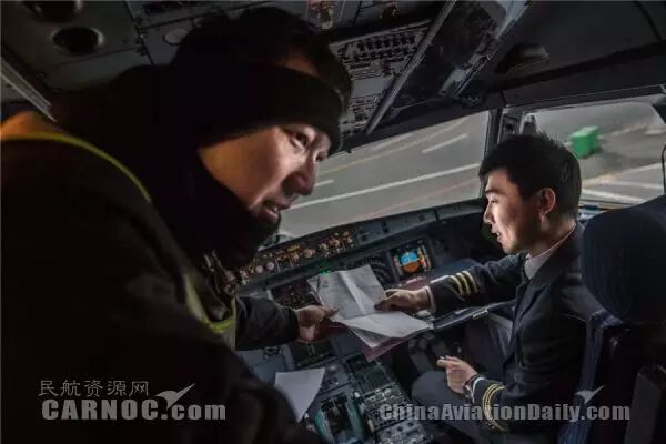 图:来到飞机驾驶舱和驾驶员签收维修保障单。(文:沈卓/图:陈松)