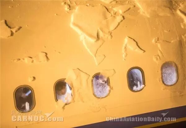 图:旅客感兴趣的透过飞机悬窗看着除冰员的除冰作业。(文:沈卓/图:陈松)