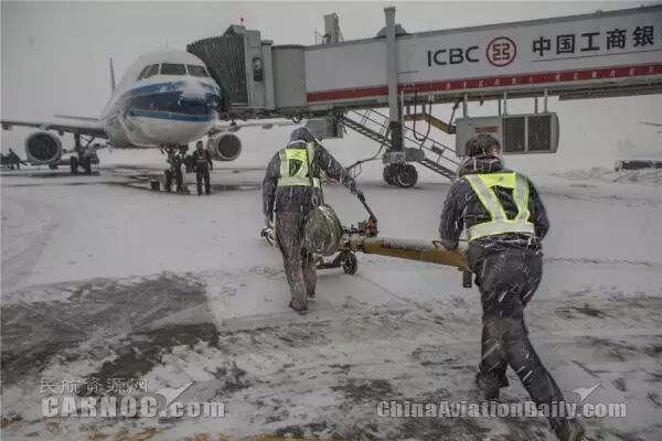 图:他和其他组员合力把牵引扛拖到飞机下。由于雪天摩擦力小几次都险些滑倒。(文:沈卓/图:陈松)