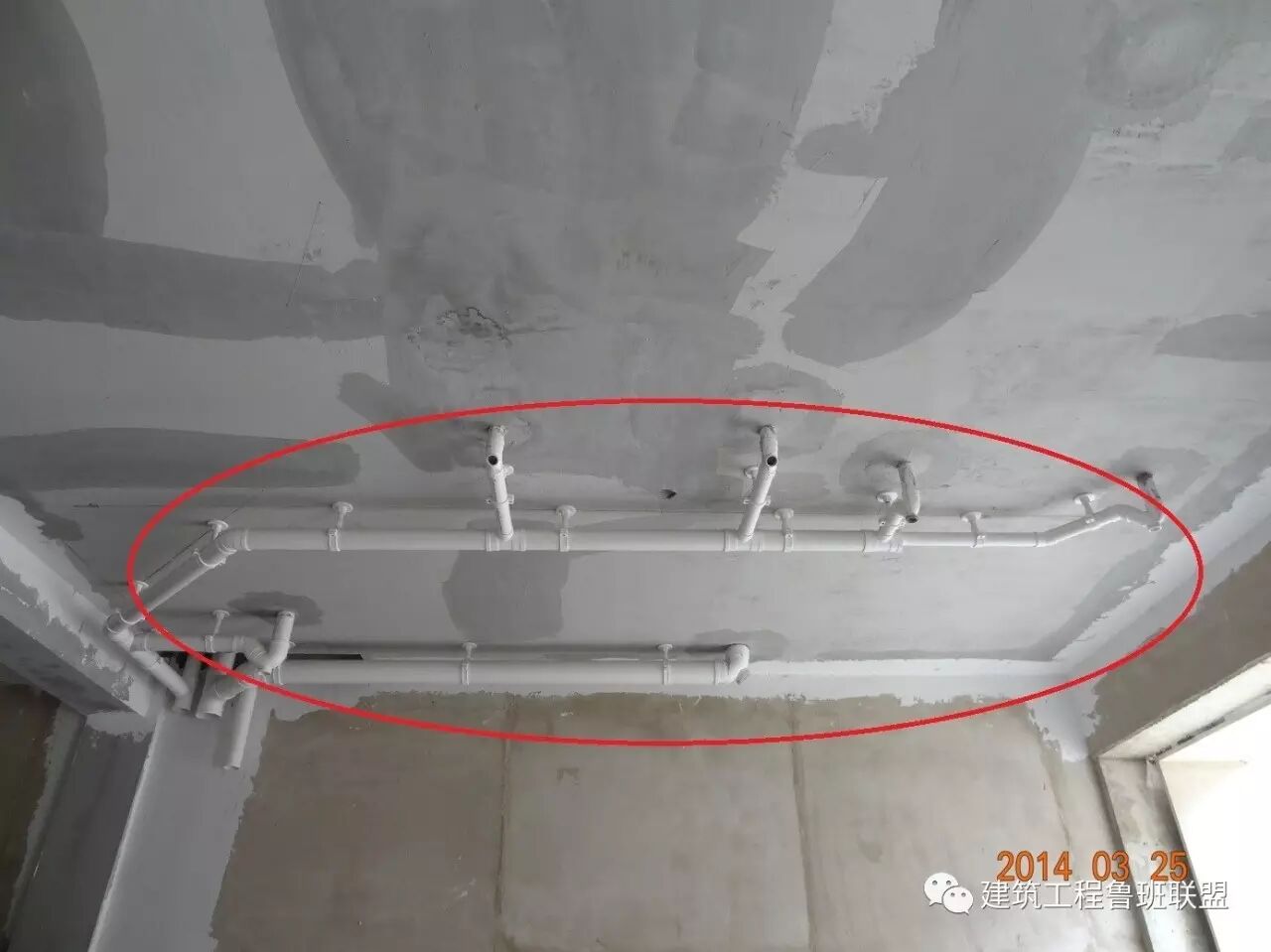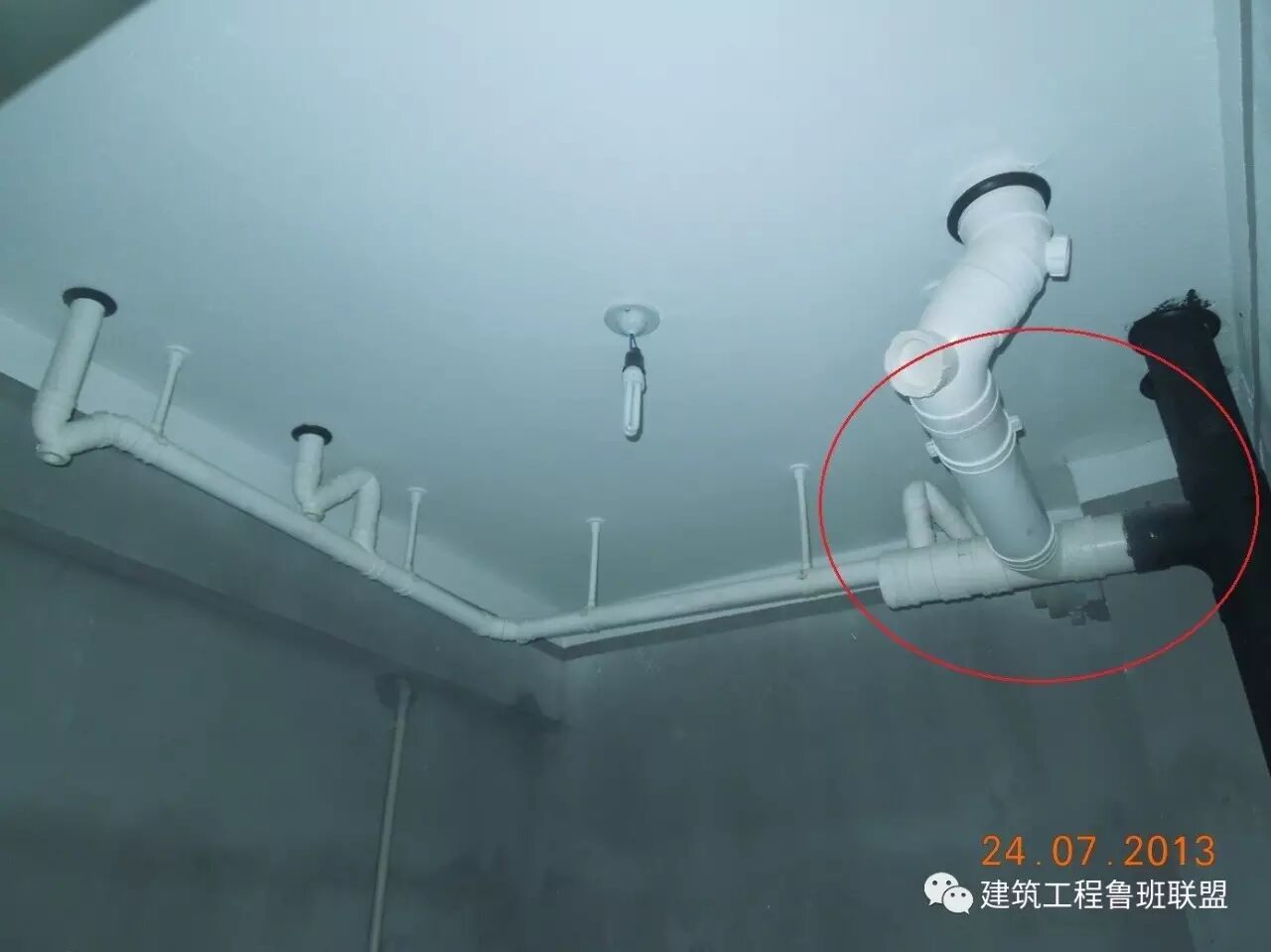 存在问题:钢琴房顶部布置卫生间排水管,材料使用U-PVC材质,存在噪音问题和渗漏隐患。