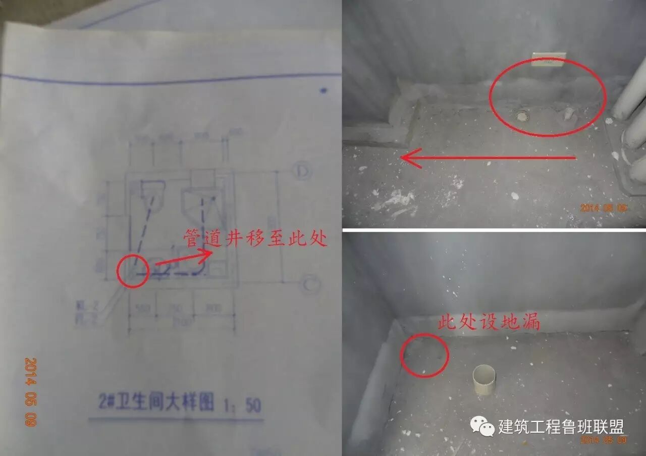 改进措施:建议除立管外的排水支管仅预留孔洞。卫生间排水支管大面安装前每个不同形式卫生间各选一个做施工样板,根据合理的卫生间设施布置图对样本间内每个孔洞复核定位尺寸,有偏差的孔洞人工修凿。样板完成经合理性评审后再大面施工。