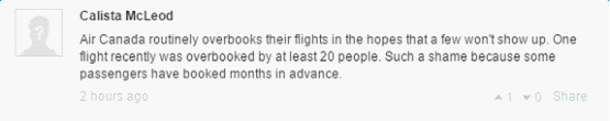 据CBC报道,安省Port Perry的Neil Crone和Kathryn Kelly提前两个多月预订了3月到美国迈阿密的度假航程,到了出发那天,两个人大清早4点钟从安省Port Perry出门,提前3小时到达机场,航班应在上午8时起飞。直到办理登机手续时他们才得知因为机票超售他们成为这次航班中的倒霉乘客,两个人被安排到下一个航班,12小时之后才起飞,两人耗在机场一整天。等他们抵达迈阿密时已过午夜,白费了几乎一整个度假日。