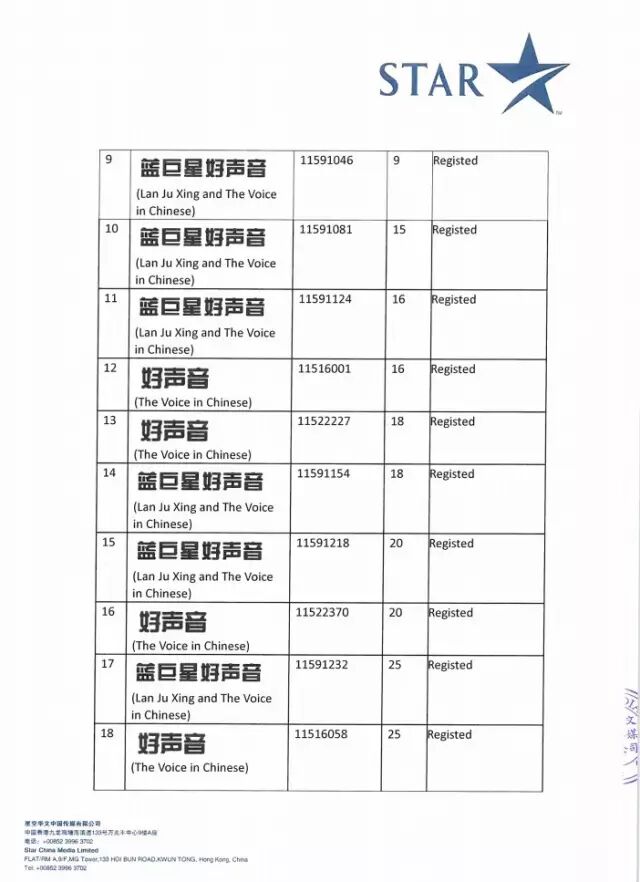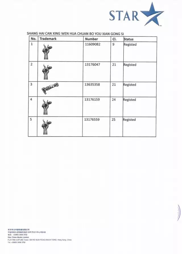 星空华文传媒公司曾明确表示,星空华文传媒已要求灿星公司及浙江卫视旗下蓝巨星国际传媒公司并得到他们的同意,承诺会将这两家公司私自注册的涉及好声音的商标都归还给荷兰Talpa公司。