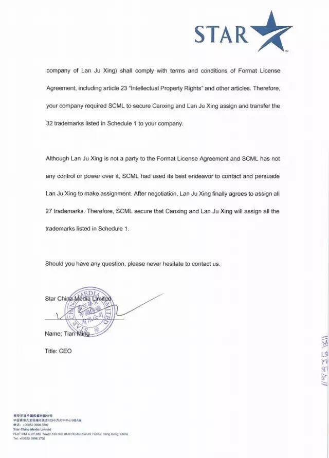 虽然蓝巨星并非模式授权协议的签署方,且星空华文对其没有任何控制或权力,星空华文已尽最大努力来联系和规劝蓝巨星进行转让。经谈判,蓝巨星最终同意转让全部27个商标。因此星空华文已确保灿星和蓝巨星转让附件1列出的全部商标。
