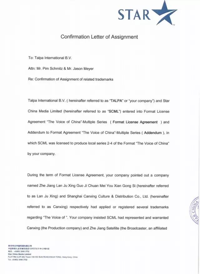 道歉函由英文撰写,大意为:Talpa International B。V。 (即荷兰Talpa公司)与星空华文传媒公司(简称“SCML”)签署了多季“中国好声音”模式授权协议以及多季“中国好声音”模式协议的附属协议,其中SCML获得授权制作本地2-4季的“中国好声音”节目。