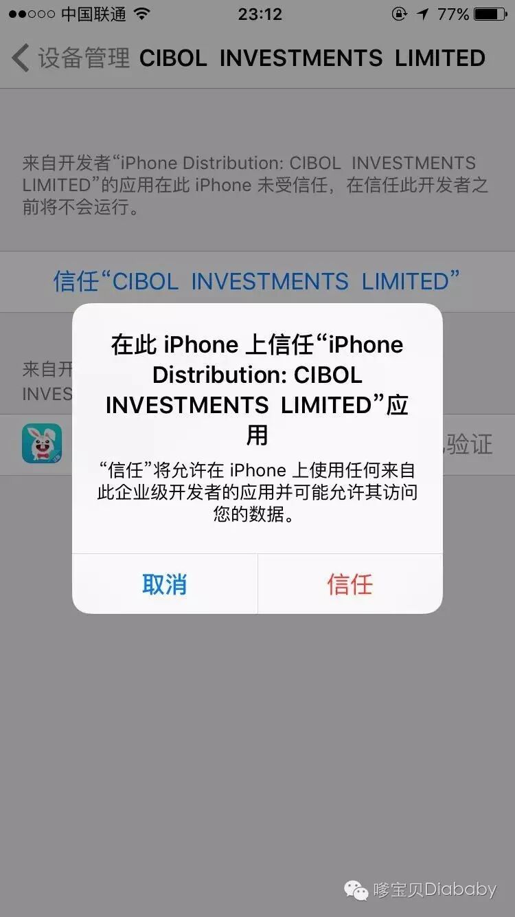 4、随后点击”通用“——”设备管理“,这时会出现企业级应用”CIBOL INVESTMENTS LIMITED",点击去选择信任