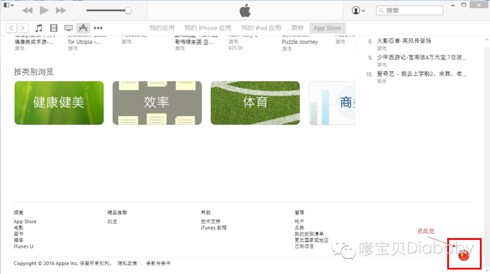 第二步:滚动鼠标拖到itunes store的最下面,点击右下角的国旗图标