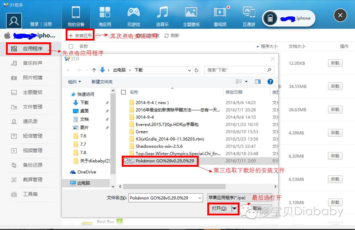 4、按照下图顺序,首先点击应用程序,然后点击安装程序,第三选取下载好的安装文件,最后点打开
