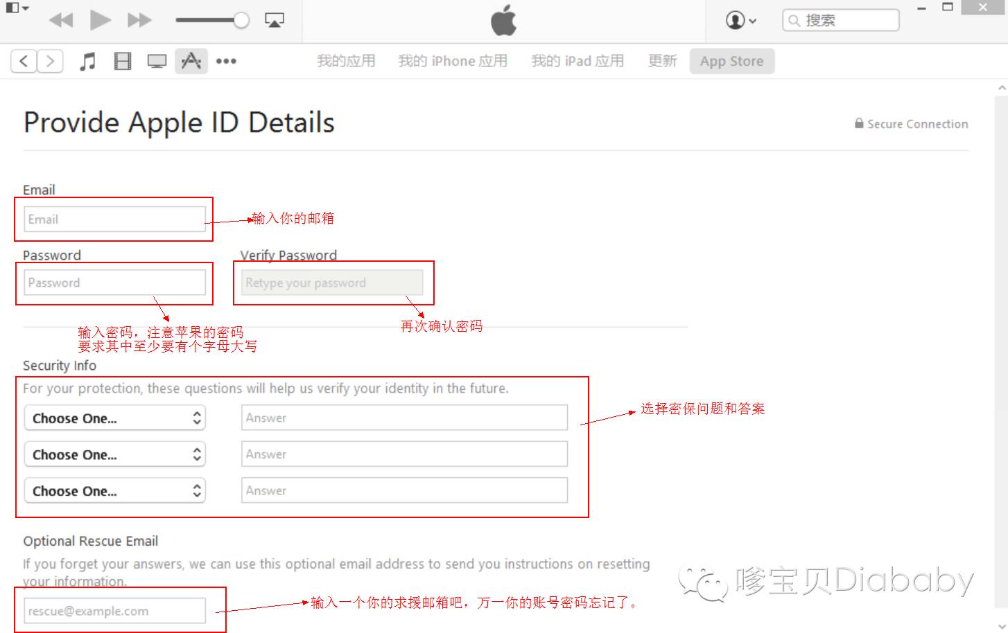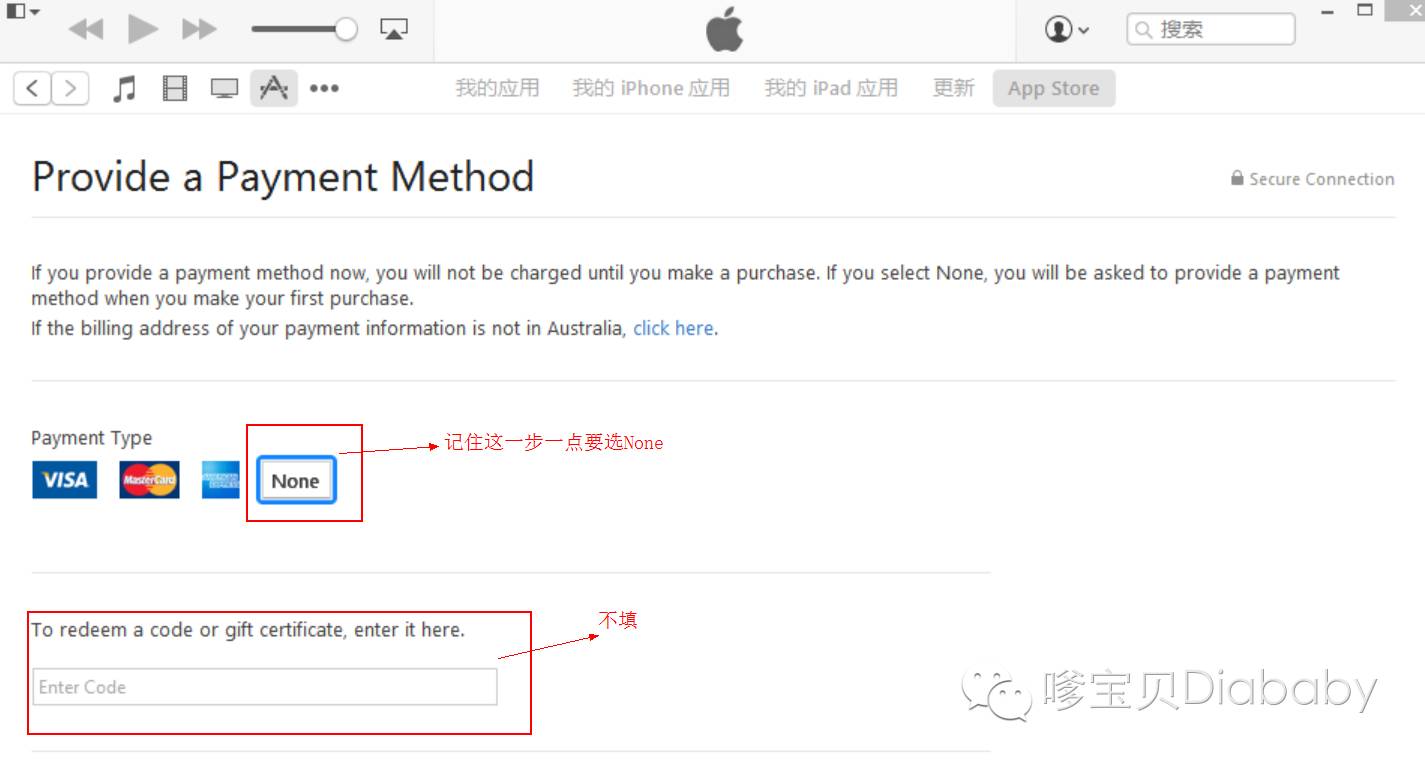 注意:手机、ipad注册不可以,为什么不可以呢? 是因为移动端一定要填写信用卡信息,而pc端的itunes store可以直接不填写选None就可以啦~~~~