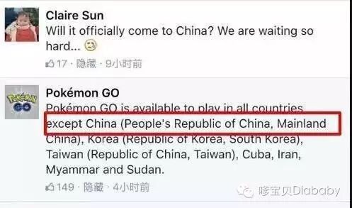 今天pokemon go官方在facebook回复一名中国玩家的提问:目前这款游戏不会在中国大陆面世。