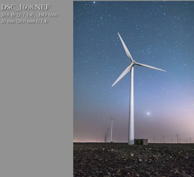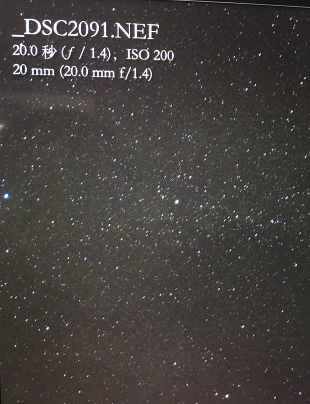 第一张使用S20拍的照片,摄于新疆乌鲁木齐附近小草湖风力发电区,时间是5月14日凌晨。因为是1.4的大光圈,我可以放心的用ISO1600甚至更低的感光度,让画质更好。同时,根据星空500法则,500除以焦段20等于25,也就是说我的最长曝光时间应该是25秒(太长了星星会拖轨),但根据我实地拍摄情况来看,哪怕是15秒曝光,放大后也会有一点点拖轨,如果要求苛刻,最长曝光时间应该不超过13秒。关于银河的拍法很简单,首先你要肉眼看到银河,然后上三脚架,镜头对准银河,拍就行了,很简单。关于对焦,我的方法是将调到MF,也就是手动对焦模式,之后打开相机的LED液晶屏,实时取景模式,放大十倍,寻找一颗比较明亮的星星,转动对焦环进行手动对焦。