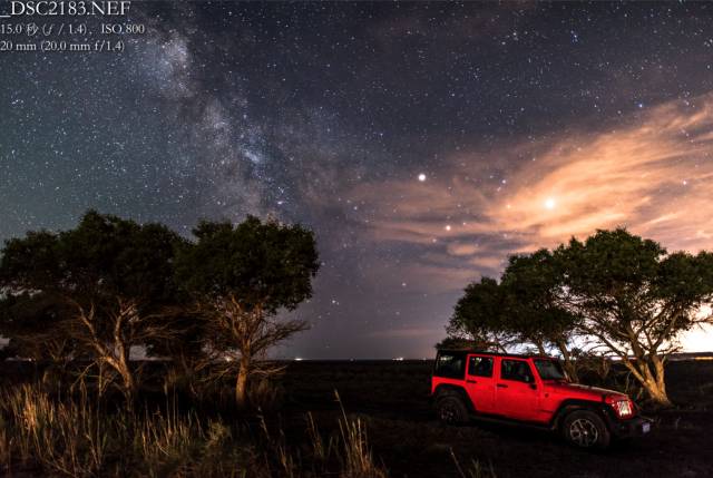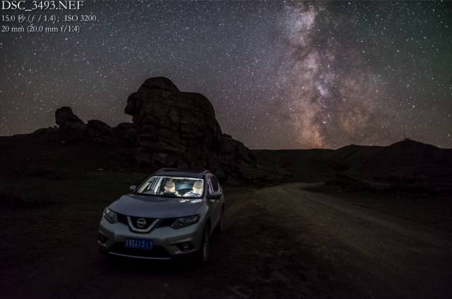 拍银河要注意,月亮出来以后,虽然地面会亮很多,但银河就会不太明显了,譬如下面这张,我用车当前景,闪了一下灯,效果还是不错的。左边那个是月亮,不是太阳,千万别弄错了。