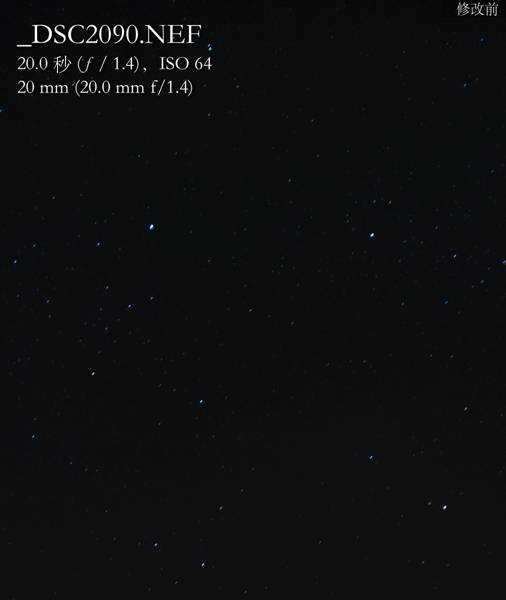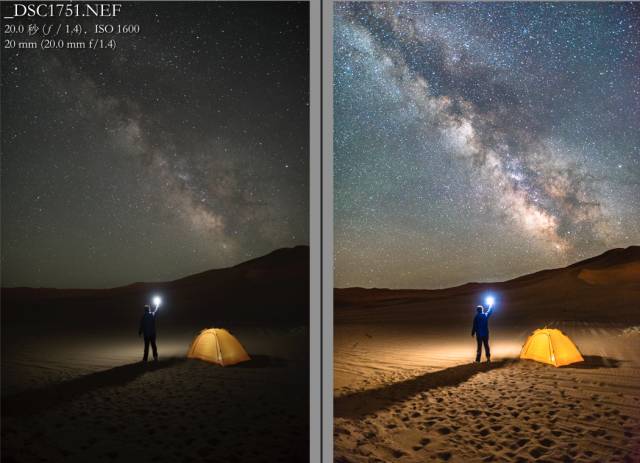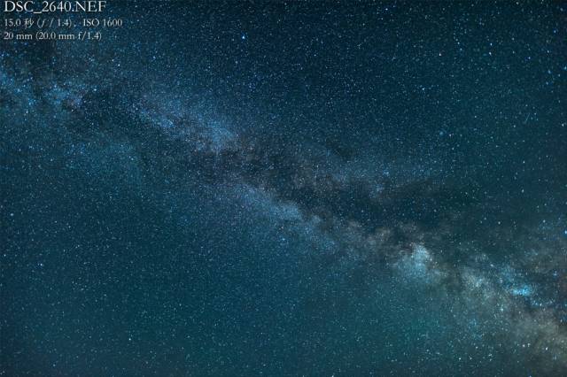 从RAW来看,20s F1.4 ISO1600拍摄到的银河就非常清楚了,我们可以根据具体环境的亮度,选择较低的ISO进行拍摄,从而达到更优异的画质。