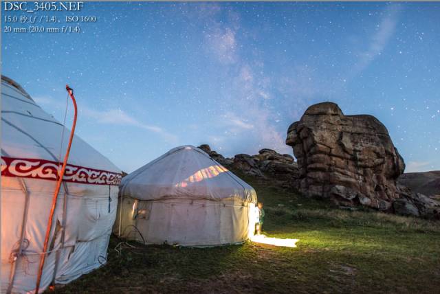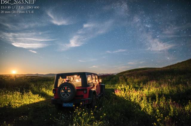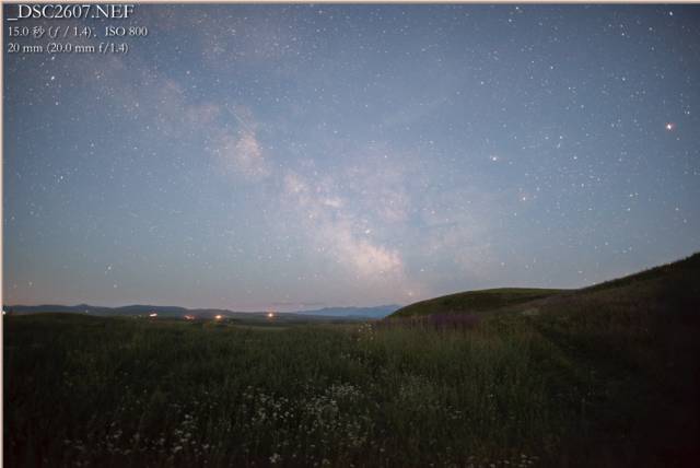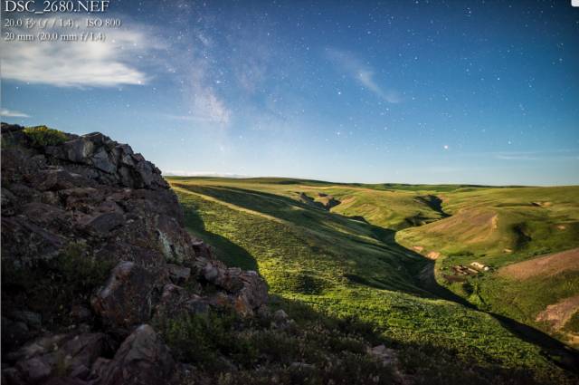 之后月亮越升越高,越来越明亮,银河也很难看清了,我们就往回走了。回宾馆的路上途径一个大草原,我顺便拍了一张,效果还可以,银河还是能看清楚的。大家可以看到,在20s F1.4 ISO800的情况下,在有月光的情况下,可以把夜晚拍的非常明亮,这种明亮的看起来像白天的夜景照片,我觉得也是很有意思的。