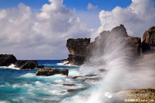 为提高成功的机率,可在波浪打到礁石时即按下快门,捕捉浪花溅起来的瞬间动感。每次浪花皆不同,须多尝试拍摄,以获取更多经验。另外,选择深色背景很重要;明亮的背景(例如远方白云)很难清楚衬托出浪花的样貌。