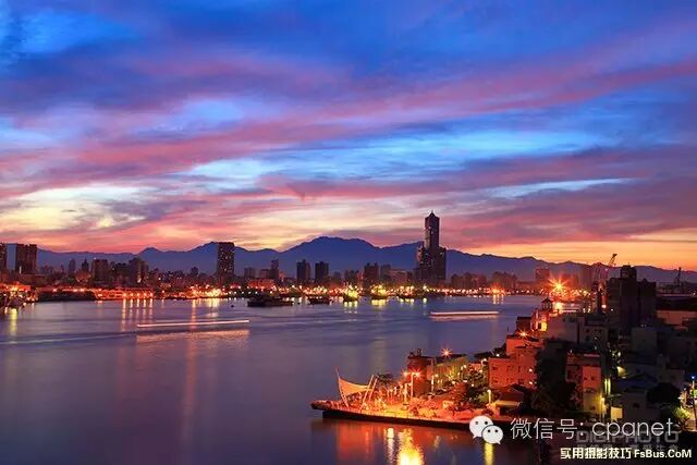 以下图为例,灯火明亮的码头及房屋组成了前景,高雄重要地标八五大楼、海水船迹及北大武山为中景,远处天空云彩则成为优美的背景。若使用中长焦段,亦可藉由压缩感与层次感,拍出意境悠远的画面。