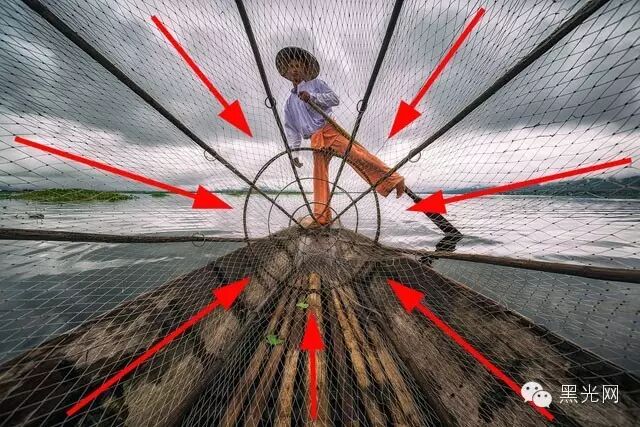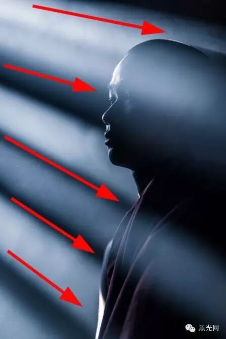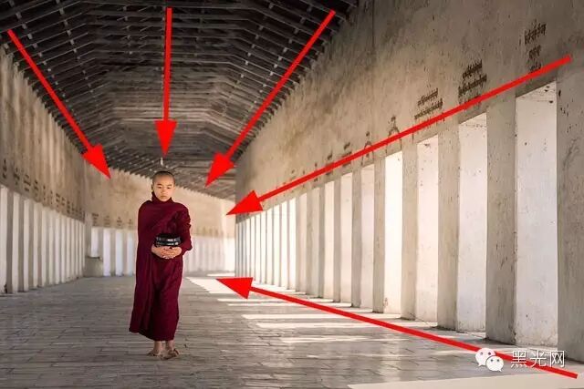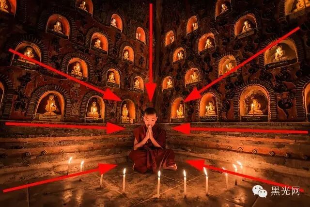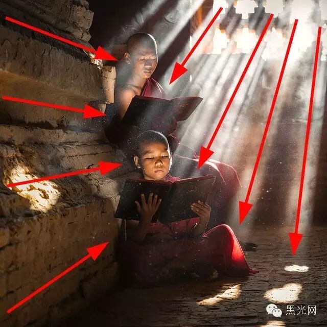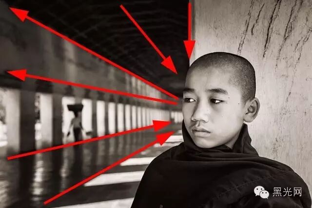 ▲这幅作品中,光线自左侧穿透阻隔打进来,小和尚站在右边,眼神逆光线而行。这种有角度的光线形成强烈的明暗反差,反而增强了照片的整体感。