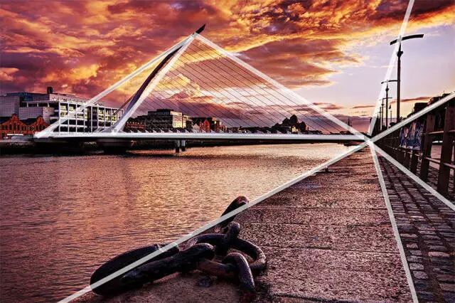 上例的下图将石头作为前景,更突显出石头的质感。 4. 框中框构图法(英: Frame within the Frame)上图利用拱形门作为里面的教堂的图框,给人一种向里面延伸的立体感。 框中框不一定是人工的拱形建筑或者窗户,像上图就是有效利用了树干作为非完全封闭的Frame,带给人一种立体感。 5. 引导线构图法(英: Leading Lines)引导线有助于将看图的人的视线集中在最重要的元素上。可以利用道路、墙壁、规则图形等作为引导线。上图有效利用地板图案上的线条作为引导线,将我们的目光引向照片的主题元素--埃菲尔铁塔。同时该图还采用了上述的左右对称法。如同上面的例图一样,引导线可以不必是直线,有时候曲线更有魅力。另外,上图同时采用了三分割法。 6. 对角线和三角形构图法(英: Diagonals and Triangles)水平线和垂直线往往给人一种安定平和的感觉,而对角线和三角形则带有一种「动的张力(英: Dyanmic Tension)」。上图采用了大量的三角形和对角线,给人一种很有张力的感觉。 上图利用隐藏的三角形和对角线,使得静的建筑物却给人一种跃动的奇妙感觉。 7. 利用图案和质感构图法(英: Patterns and Textures)人总是被一些规整的图案或者质感十足的东西所吸引。比如下图,地板上的规则图案让我们的视线最终聚集在圆顶建筑物上。同时屋顶上的规整图案也使得建筑物本身魅力十足。上图有效利用光和影将地面石板的质感、以及墙壁和屋顶的质感表现得淋漓尽致。同时该作品还采用了框中框构图法,使得照片又有了一种向里面延伸的立体感。 8. 奇数法则。(英: Rule of Odds)采用奇数构图法,感觉更自然。上图同时运用了框中框构图法。 9. 主体覆盖整个画面法。(英: Fill the Frame)例图整个画面只展现了狮子的脸部。这样的话,可以使人细微地观察狮子的眼神和毛发。仔细看看,此图同时还采用了三分割法。 10. 利用负形空间构图法。(英: Leave Negative Space)与前一个方法正好相反,给主题元素留有足够的空间,通过简单的背景突出主体。如上图所示,有效利用空间,图片干净明了,使人们的视线易于集中在主题元素--铜像上。同时该作品也采用了三分割法。 11. 极简极小构图法。(英: Simplicity and Minimalism)Less is More. 少即是多。构图简单,却生动地表现了露珠的晶莹与叶子的苍翠。 12. 孤立主体对象构图法。(英: Isolate the Subject)模糊背景突出主体,特别适用于人物、动物写真等。 13. 改变视角构图法。(英: Change Your Point of View)从高处或者贴近地面等,从另一个视角摄影出来的作品有时更有魅力。高处摄影很适用于拍摄夜景。 14. 特殊颜色组合构图法。(英: Look for Particular Colour Combinations) 摄影时,如果能用到色环上相对的颜色进行组合构图,效果很不一样。上图采用暗蓝和金黄两种颜色的特殊组合,对比明显,更显灯光绚丽夺目。 15. 空白法则。(英: Rule of Space)注意照片主体的朝向和动向,合理地在画面上制造空白可以收到意想不到的效果。在船的行进方向留白,动感立现。 16. 从左到右法则。(英: Left to Right Rule)同读文章一样,我们也更习惯从左往右看照片。采用从左到右法则,比如下图,再加之右面的空白,就显得整个照片动感十足。同时该作品也采用了「三分割法」和「框中框构图法」。 17. 平衡法则。(英: Blance Elements in the Scene)将主题元素(大处理)和非主题元素(小处理)同时拍摄进去,使得主题元素不过于集中。利用近大远小,维持被摄体的平衡,更能表现出向里面延伸的立体感。 18. 陈列法。(英: Juxtaposition)在拍摄两个以上的对象时,采用陈列法则进行构图,使得对象之间形成对比或互补效果。 19. 黄金三角形构图法。(英: Golden Triangles)同「三分割法」相似。首先连接对角线,然后从剩下的两点向对角线作垂线。拿上图进行说明,通过将铜像排列在对角线上,引导人们的视线集中到主题元素--埃菲尔铁塔上。而埃菲尔铁塔又处于黄金点上。 20. 黄金比构图法。(英: Golden Ratio)源于古希腊,广泛运用在美丽的艺术作品和建筑布局中。 最后要想将本次所列举的20个法则一下子全部记住,恐有难度。下次摄影的时候,不妨先尝试着运用两三个看看吧。另外,正如开篇所讲,世上没有完美的摄影方程式可供套用,上述的有些法则甚至是相对的,因此根据场合和经验采用合适的构图法很有必要。 本文转载来源:简书作者:在雨缝中行走如需转载,请联系作者,不允许二次转载。